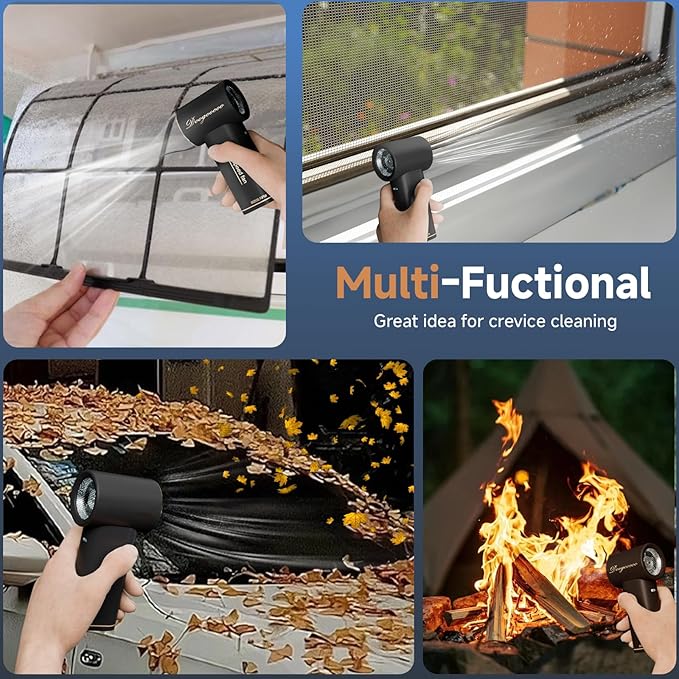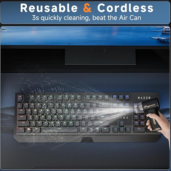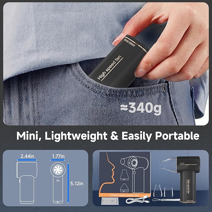 - [Upgraded MINI Compressed Air Duster] - Made with industry-leading 3C power battery technology. The power increased by 30%, durability increased by 100%, and usage time increased by 200%; Besides, this electric cordless air blower has 5 gears adjustable. The size of only 5.1x2.4in and a weight of 398g. It is small and lightweight but powerful efficiently dust cleaning for computer, keyboard, air conditioner, home, car and outdoor. BTW, it also can make a fire.