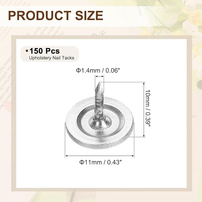 - [Size & Quantity] - The package comes with 150pcs decorative upholstery tacks. Sufficient quantity to meet your different daily needs. The overall size of upholstery nails is about 11mm x 10mm/0.43-inch x 0.39-inch(D*H)