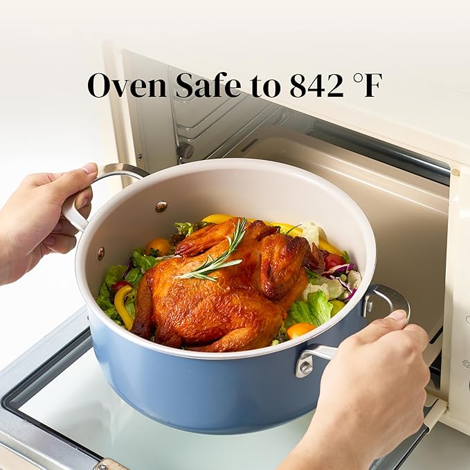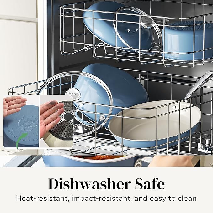 - Healthy Ceramic Coating: Redchef kitchen ceramic cookware set features a natural ceramic coating free from Teflon, PFAS, PTFE, PFOA, lead, and cadmium, ensuring safety and health. You can enjoy your cooking on cookware safely & easily