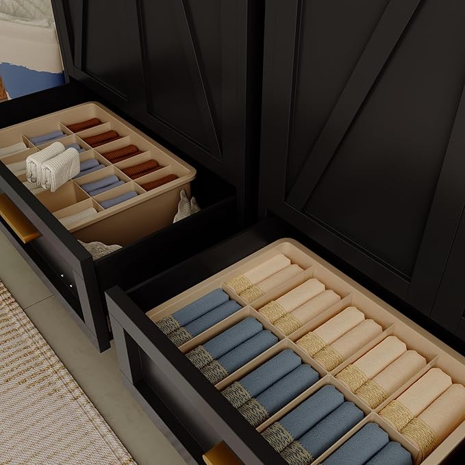 71'' Black Farmhouse Metal Wardrobe Cabinet with Hanging Rod, 2 Barn Door Wardrobe Closet with Adjustable Shelves,Drawer,for Dining Room,Bedroom,Living Room, Cloak Room,Office