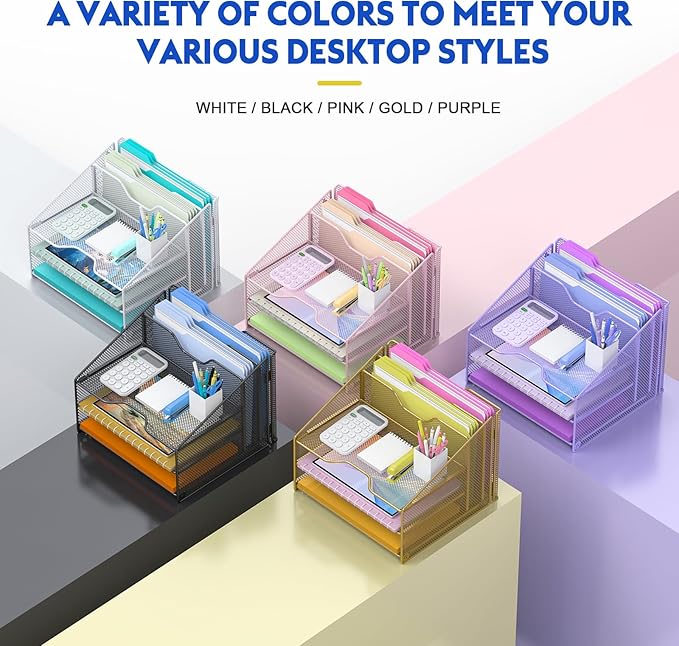 - Unique 3+2 Shelves Design: 3 Tier sliding trays are perfect for storage all your documents,file folders and other desk accessories, 2 upright section is ideal for place your other paper/letters vertically.