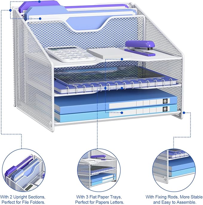 samstar White Desk File Organizer, Mesh Letter File Folder Holder with 3 Paper Trays and 2 Vertical Upright Section, for Office Supplies, Desk Accessories & Workspace, White