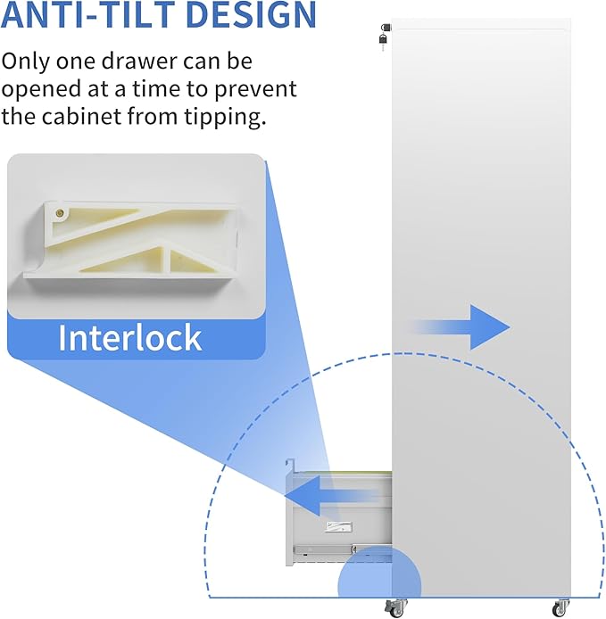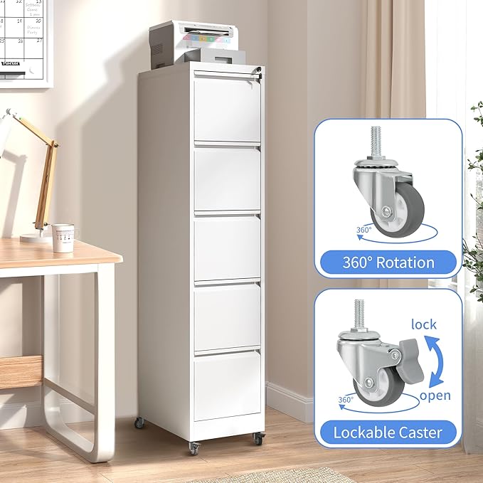 - 【Rolling Fill Cabinet】This 5 drawer under desk file cabinet equipped with 2 lockable casters, 2 x 360° swivel casters and1x anti-tilt wheel. The anti-tilt caster to prevent tipping over. You can easily move the cabinet with wheels, making it easy for you to move to another place.