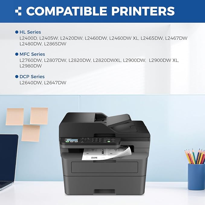 - To use with: Compatible for Brother HL-L2400D, HL-L2405W, HL-L2420DW, HL-L2460DW, HL-L2465DW, HL-L2467DW, HL-L2480DW, HL-L2865DW, HL-L2460DW XL, MFC-L2760DW, MFC-L2807DW, MFC-L2820DW, MFC-L2820DW XL, MFC-L2900DW, MFC-L2900DW XL, MFC-L2980DW, DCP-L2640DW, DCP-L2647DW Laser Printer.