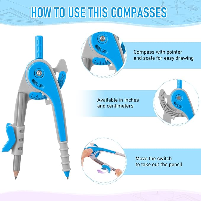 - 2 Diverse tips design compass: compass is made of plastic, sturdy mechanism can hold a radius well; The opposite side of the pencil end is an adjustable separated jaw, which allows you to fix the pencil