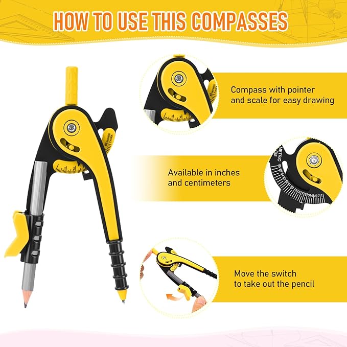 - 2 Diverse tips design compass: compass is made of plastic, sturdy mechanism can hold a radius well; The opposite side of the pencil end is an adjustable separated jaw, which allows you to fix the pencil