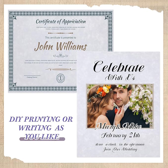 - Work As Different Things: these plain certificate papers are flexible in use, you can use them as certificate printing, wedding invitation, birthday invitation, restaurant menu, theme party decoration and so on, running smoothly in laser and inkjet printers, copiers and offset applications without jams