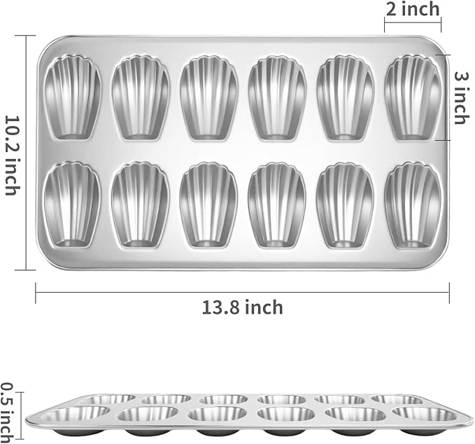 - 2 Pieces 12-Cup Madeleine Pans Set- The Madeleine Pan with 12 Cavity enables you to enjoy making at home better. The Madeleine mold features a Dimensions 15 ⅔ x 7 x ⅔’’ | Well: 3 x 2’’, making it perfect for sharing with friends and families.