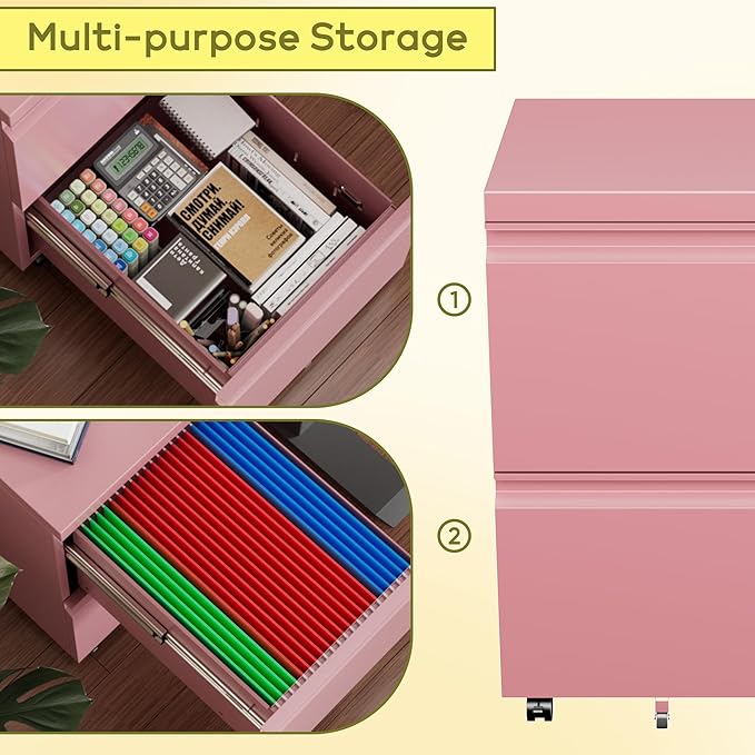 Aobabo Metal 2 Drawer Office File Cabinet with Lock, Under Desk Office Steel Files Cabinet on Wheels, 25.6''H Legal/Letter A4 Size, Fully Assembled Except Wheels,Pink