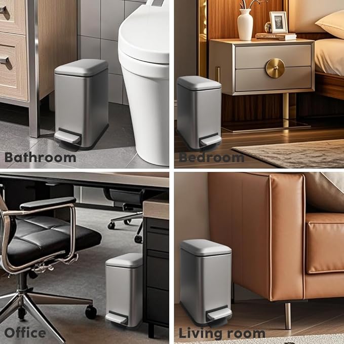- Space-Saving Design: Perfect for small spaces like kitchens, offices, bedroom and bathrooms, this 1.3 gallon slim trash can fits seamlessly into tight corners without compromising on functionality.