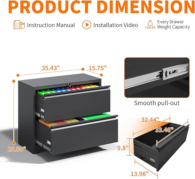 - 【Ample Storage Capacity】 This lateral file cabinet boasts a total size of H28.5"×W35.4"×D15.7", while the interior size of each drawer is H9.8"xW32.4"xD14". With three drawers and an adjustable hanging rail inside, it provides more than enough space to effortlessly hang Legal/Letter/A4 files or store your various belongings.