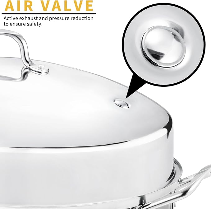 - 【Roasting Rack + Active Vent Lid】This Stainless Steel Roasting Pan with Rack includes an elevated roasting rack that lifts food off the pan bottom, letting excess fat drip away for healthier, crispier results (great for roasted veggies too!). The tight-fitting lid of this Large Roasting Pan features a built-in active vent valve, releasing steam automatically to prevent sogginess while locking in moisture and flavor.