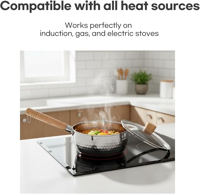 1.5 Quart Stainless Steel Pot With Glass Lid. Traditional Japanese Saucepan Wth Wood Handle, Multipurpose Sauce Pan With Two Side Pour Spouts & Measurement Line, Great for Ramen, Milk etc.
