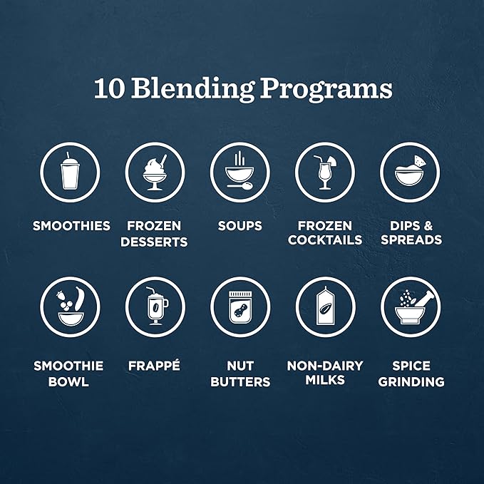 - 10 Blending Programs: 10 automatic Blending Programs for Smoothies, Frozen Desserts, Soups, Frozen Cocktails, Dips & Spreads, Smoothie Bowl, Frappé, Nut Butters, Non-Dairy Milks, and Spice Grinding
