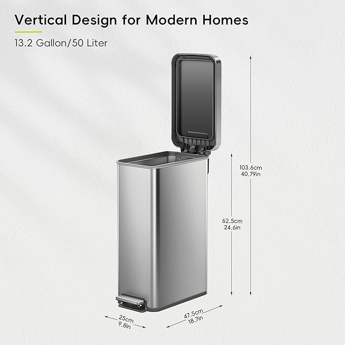 - Slim & Space-Saving - Slim and narrow, this 50L vertical trash can fits easily into tight spots—between cabinets, beside appliances, or along walls. A clean, efficient solution where floor space is limited