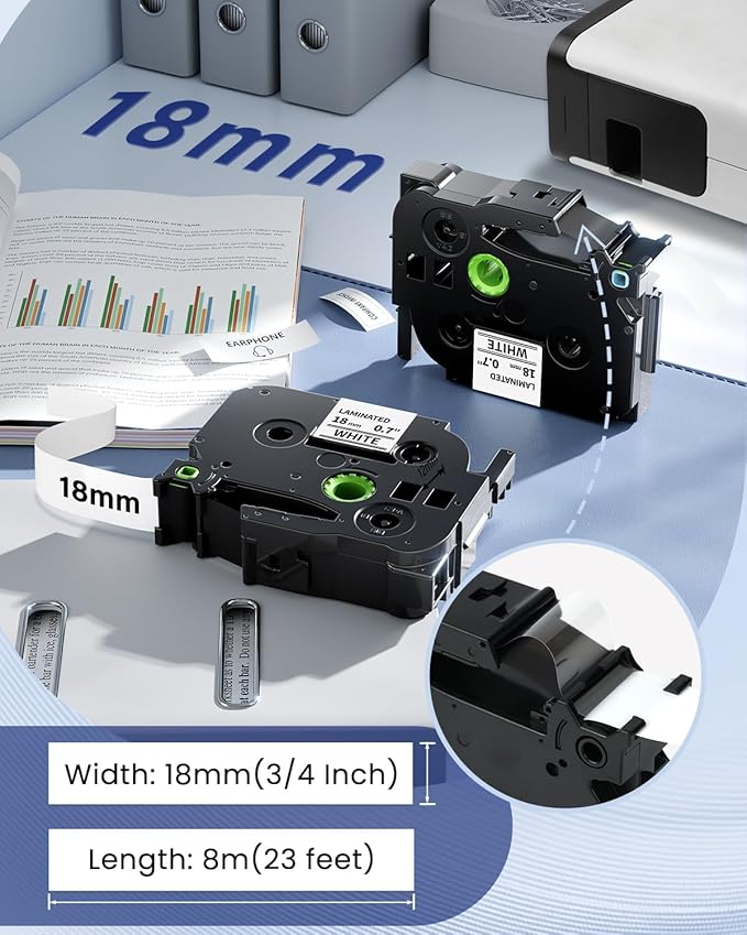 - Outstanding performance for indoor and outdoor use, all these label maker tape 18mm 0.7 white won't sumdge or smear when using, water and oil tolerant, abrasion, fade and temperature. Designed for smooth, flat surfaces like office paper, file folders and binders