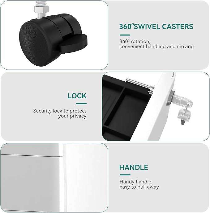 - Free-range Mobility with 5 Casters: This lockable filing cabinet has 4 x swivel casters (two of them are lockable) + 1x anti-tipping central caster; Easy and safe to move! 360°swivel casters provide great multi-directional mobility with little effort