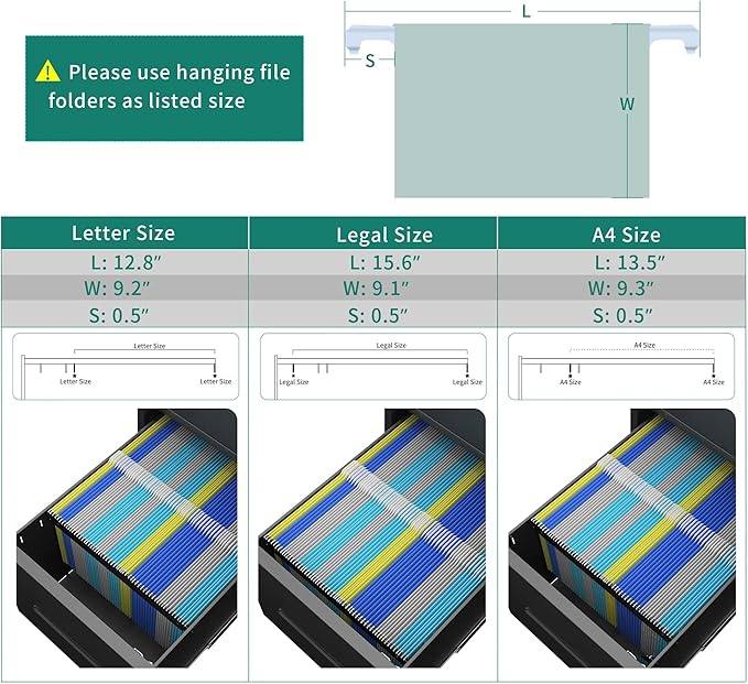 - Spacious Drawers: The top drawer contains a removable pencil tray, while the bottom drawer features a removable hanging file bar that accommodates letter, legal, and A4 size documents; Keep your files organized